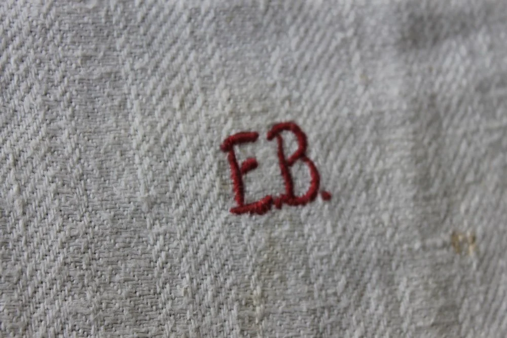 This towel belonged to my husband Thomas’ German grandmother. Her initials E.B. are embroidered with red thread, typeface unknown.